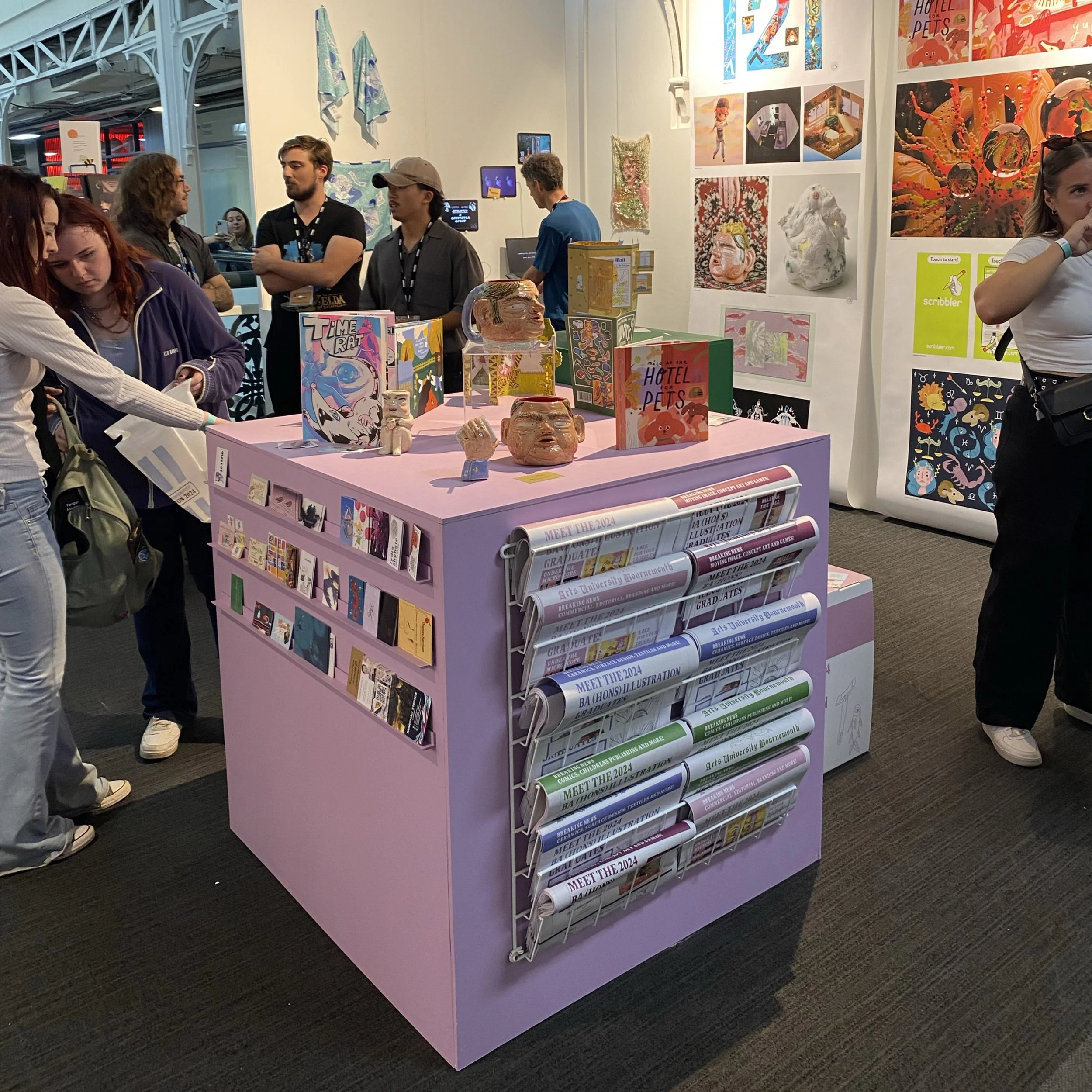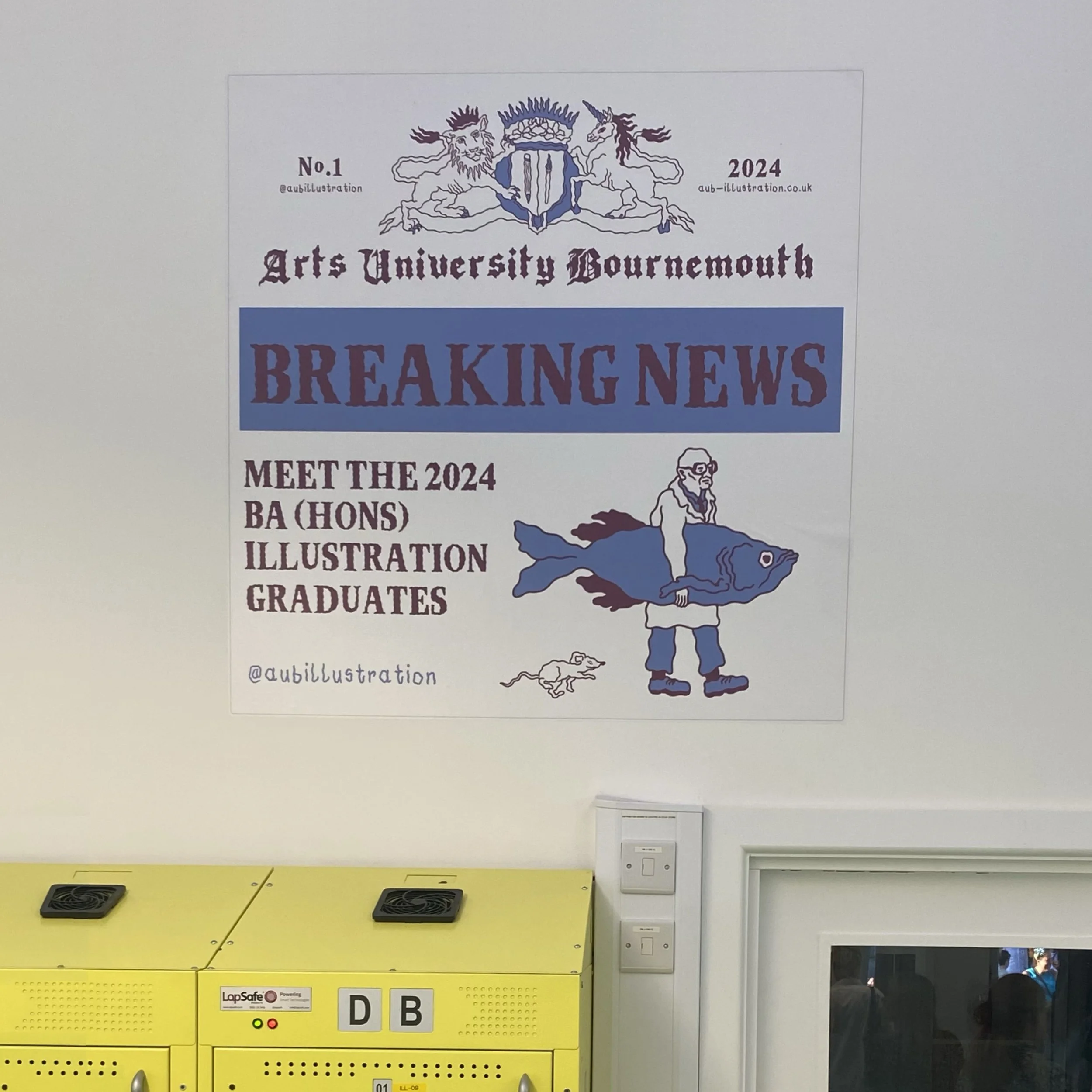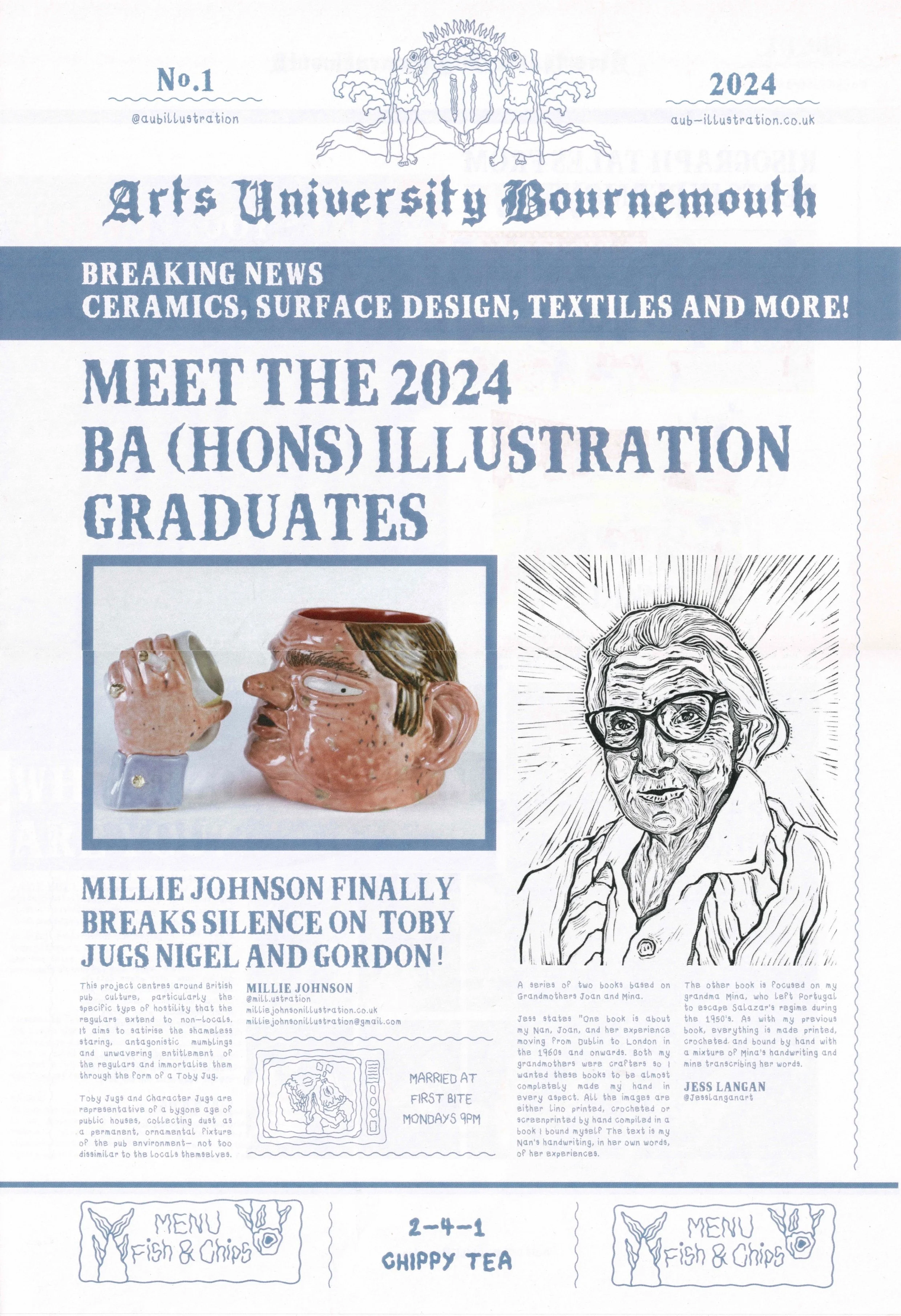 I was honoured to be chosen to create illustrations and fonts for the branding of Arts University Bournemouth's graduation show and the New Designers show. Collaborating closely with university technicians, I developed newspaper and fish-and-chip-themed visuals and fonts for the catalogues and promotional bags. This project was incredibly enjoyable, and seeing the final products in use was truly rewarding. Additionally, the plastic bags we designed are fully home-compostable, highlighting our commitment to sustainability.
